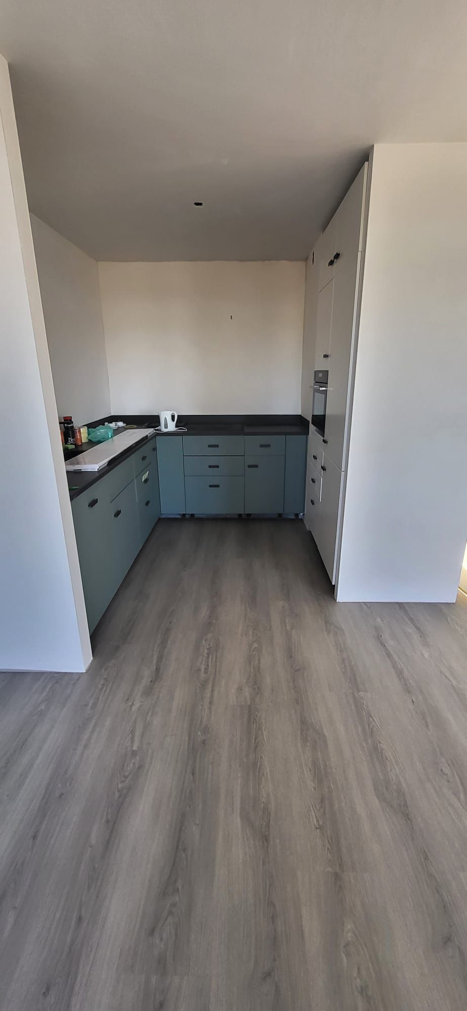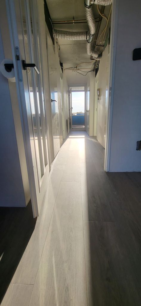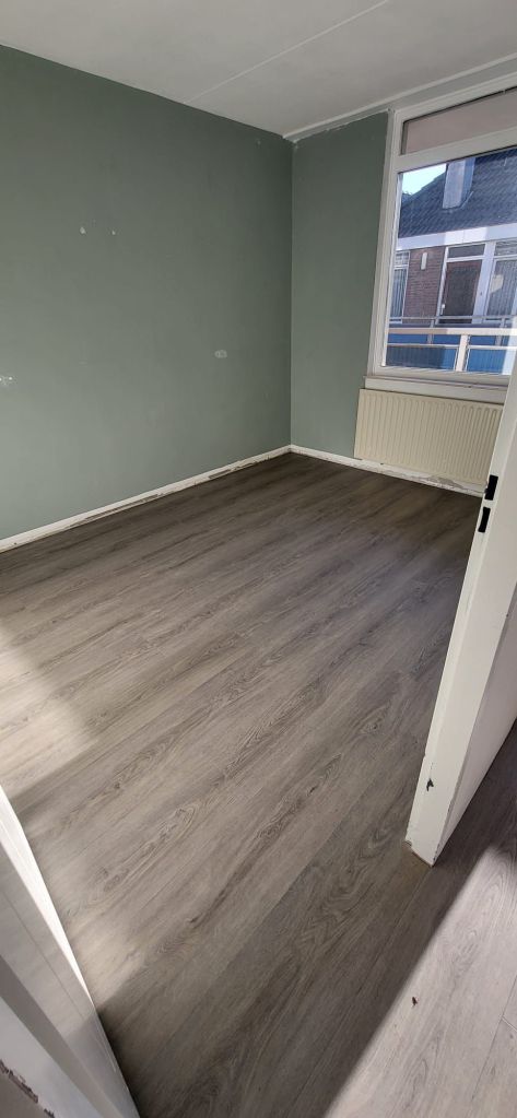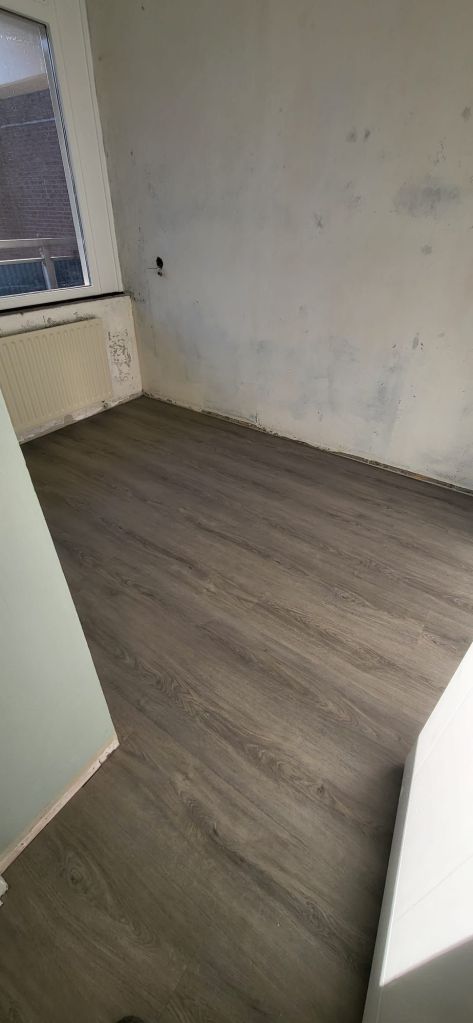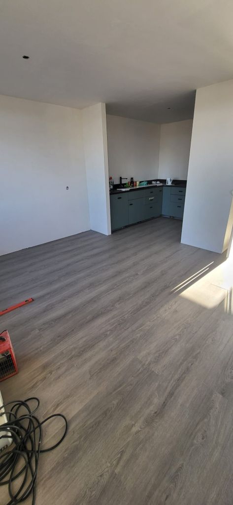 Na het egaliseren hebben we circa 60m² donker rechte PVC vloer gelegd. Deze stijl zorgt voor een rustige en moderne uitstraling en is makkelijk te combineren met verschillende interieurstijlen.